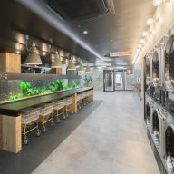 国道に向かって全面ガラス張りの店内には、これまでのAQUARIUM LAUNDRYの大型水槽の中でも最大となる全長6mの超巨大水槽を設置しました。