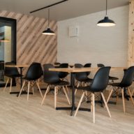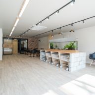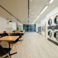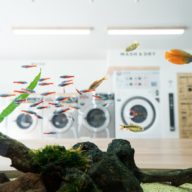 白と木目を基調とした店内に入ると、まずは全長2.5mの巨大水槽と色とりどりの淡水魚の姿が目に入るはずです。ここでは、まるでお魚たちがコインランドリーを優雅に泳ぎまわっているような錯覚を味わうことができるでしょう。